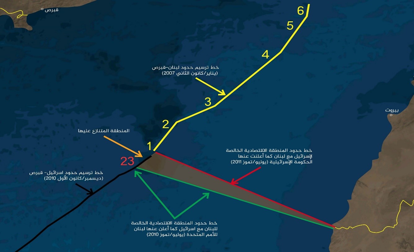 يعود الخلاف على ترسيم الحدود البحرية بين لبنان وإسرائيل في جزء كبير منه إلى الإجراءات التي قامت بها قبرص، والتي نجم عنها اتفاقيات ثنائية منفصلة مع عدد من دول شرق البحر المتوسط؛ مما أدى إلى تداخل بين الحدود البحرية المرسومة بناء على هذه الاتفاقيات، وإلى انتهاك حقوق عدد من الدول من بينها لبنان. ولأن لبنان لا يعترف بوجود إسرائيل وفي حالة حرب معها منذ عقود تتخللها هُدَن بعضها قصير والآخر طويل الأجل، حالت هذه المعطيات بالإضافة إلى تعقيدات أخرى دون التوصل إلى تفاهم بين الطرفين. في 17 يناير/كانون الثاني 2007، توصلت قبرص ولبنان إلى اتفاقية لترسيم الحدود البحرية بينهما. تضمن الاتفاق في مادته الأولى (الفقرتين 4 و5) ومادته الثالثة إشارة إلى ضرورة أن يبلغ أي طرف منهما الآخر ويستشيره أولًا في أي خطوة من شأنها أن تؤثر على الإحداثيات المشار إليها(11).