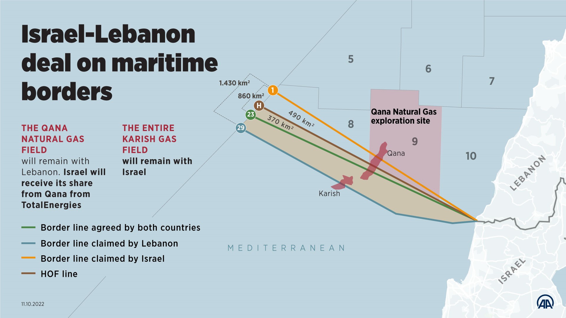 في أكتوبر/تشرين الأول من العام 2022، وبعد سنوات طويلة من النزاع والتفاوض المتواصل بوساطة أميركية، توصل الجانبان، اللبناني والإسرائيلي، إلى اتفاق يقضي بترسيم الحدود البحرية بينهما، ويسمح للطرفين باستغلال الثروات في باطن البحر على طرفي الحدود بشكل كامل ودون عوائق. ويرسي الاتفاق قواعد التفاهم حول النقاط المختلف عليها، كما يُنشئ مجموعة من المصالح المشتركة التي تتيح استمراريته، ويوفر ضمانات أميركية للطرفين للحفاظ على ما تم التوصل إليه من تسويات مرتبطة بالنزاع.
