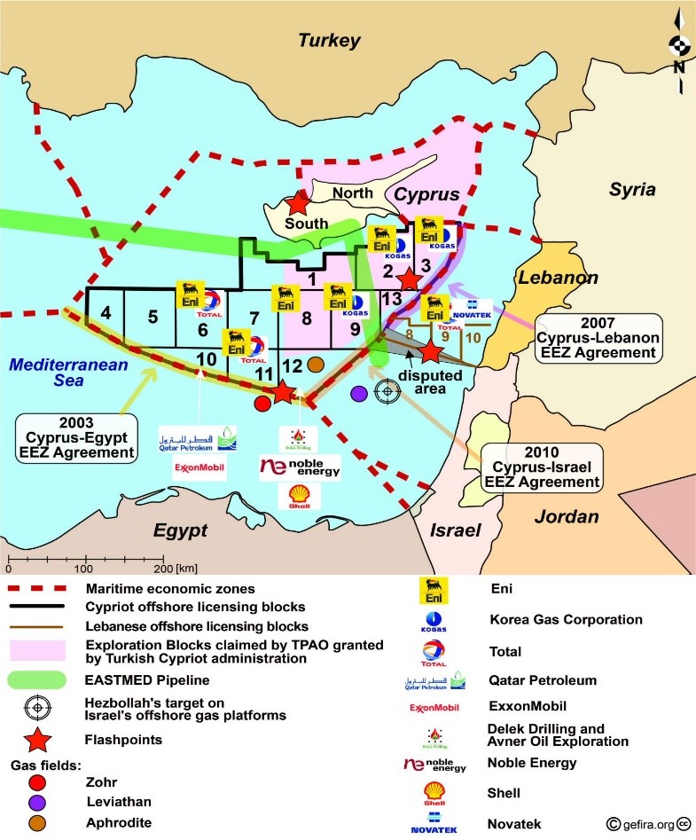 إجراءات قبرص الأحادية تسببت أيضًا بمشكلة مع تركيا، فضلًا عن المشكلة التركية-اليونانية. وتعتبر تركيا أن المنطقة الاقتصادية الخالصة التي حددتها قبرص اليونانية تتداخل مع الجرف القاري التركي ومع المنطقة الاقتصادية الخالصة التابعة لها (لم يتم الإعلان عنها رسميًّا). وترى أنقرة أن إرساء المناقصات على الشركات الأجنبية للبحث والتنقيب عن الغاز في هذه المنطقة غير قانوني، لأنه ينتهك حقوقها. علاوةً على ذلك، هناك نزاعات أخرى على ترسيم الحدود البحرية بين كل من اليونان وليبيا، وتركيا واليونان، ومصر وليبيا، وسوريا ولبنان، وإسرائيل والسلطة الوطنية الفلسطينية، ولبنان وإسرائيل. وتعود هذه الخلافات بشكل أساسي إما إلى اختلاف المرجعية القانونية والآليات التقنية في ترسيم الحدود، وإما إلى غياب آلية لحل النزاع، وإما إلى الخلل في موازين القوى حيث تمتعت إسرائيل بالإضافة إلى اليونان وقبرص بدعم لا محدود وغير مشروط تاريخيًّا من القوى الدولية لاسيما الولايات المتحدة في حالة إسرائيل، والولايات المتحدة والاتحاد الأوروبي في حالة اليونان وقبرص، وهو ما عقَّد من معادلات الصراع شرق البحر المتوسط وعرقل من جهود تسويته بشكل عادل بين الدول المتصارعة.