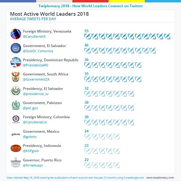 إن متابعة الرئيس الفنزويلي الراحل، هوغو شافيز، رؤساء الإكوادور والأرجنتين والبرازيل وكوبا على تويتر، وضع خريطة تحالفات للحكومات اليسارية التي مَيَّزت منطقة أميركا اللاتينية. بينما شكَّل التفاعل على تويتر بين رؤساء حكومات كولومبيا وشيلي وبيرو محورًا لحكومات يمينية، وهو ما يشير إلى خريطة أخرى للتحالفات في المنطقة ظلت إلى غاية 2014، مع بعض الاستثناءات. لذلك أصبح الاهتمام بالمتابعة على تويتر مؤشرًا دبلوماسيًّا، دفع العديد من الدول إلى العمل لكي تكون محلَّ متابعة من قبل زعماء لهم تأثير على المسرح الدبلوماسي العالمي.