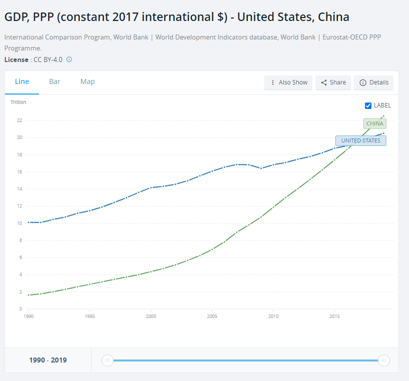 (15) The World Bank, “GDP, PPP (constant 2017 international $)- United States, China,” The World Bank Database, “accessed August 9, 2020”. https://bit.ly/3kqrJZ6.