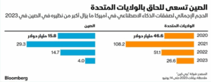 - الاستثمار في التكنولوجيا الناشئة: كلا البلدين يستثمران بكثافة في مجالات مثل الذكاء الاصطناعي، وهو مجال يُتوقع أن يكون له تأثيرات جذرية على الاقتصاد العالمي. الذكاء الاصطناعي يمكن أن يغير كيفية تعاملنا مع كل شيء بدءًا من الرعاية الصحية حتى الأمن القومي. انظر الرسم البياني التالي:
