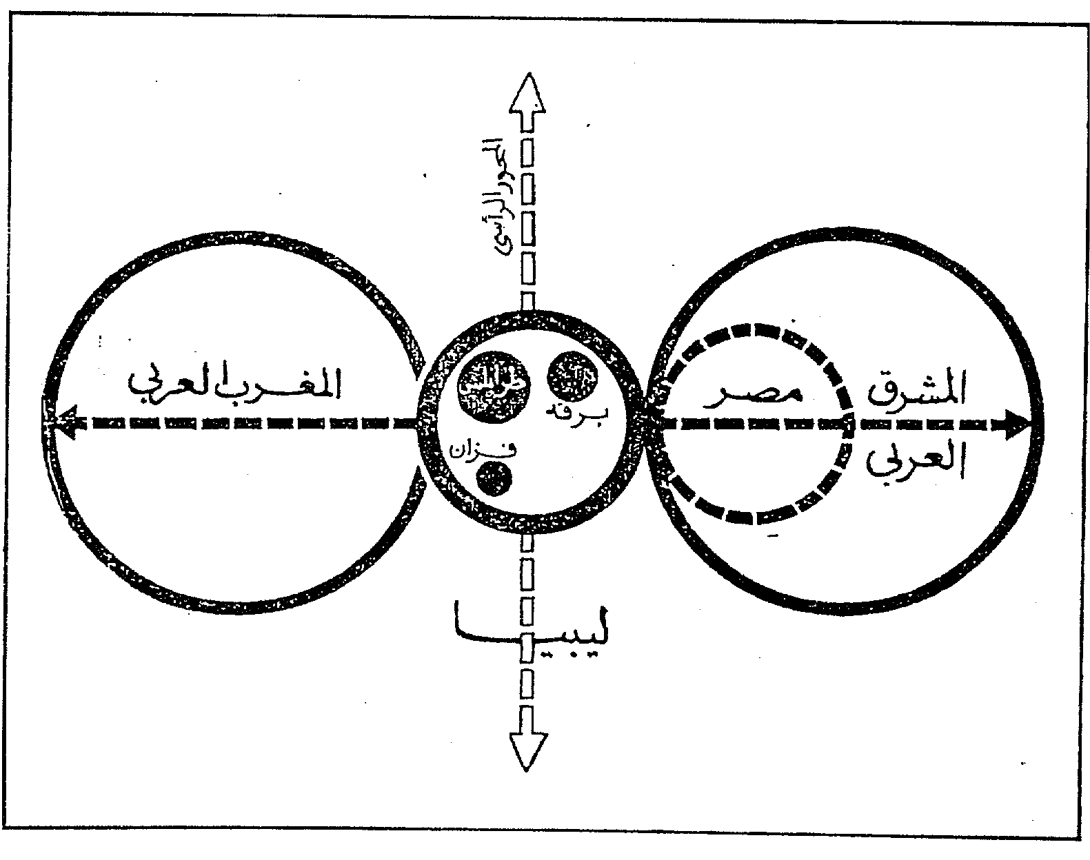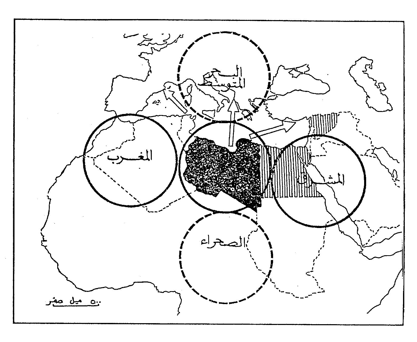– ويلي ذلك في الأهمية البعد المشرقي لليبيا، الذي يربطها بمصر والجزيرة العربية، والمشرق العربي بشكل عام. فهذه الدائرة المشرقية “هي الثِّقل المقابل والمغناطيس المضاد [للبُعد المغاربي]، دون أي تعارض أو تناقض مع ذلك. منها استمدَّت ليبيا عروبتها وإسلامها، أو ثقافتها وعقيدتها، بينما كانت ليبيا هي التي قدَّمت العرب والإسلام إلى المغرب وقدَّمته إليهما”(49).