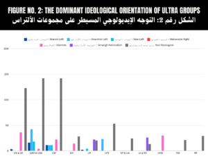 تؤكد هذه النتائج أن الانتماءات الأيديولوجية لأعضاء مجموعات الألتراس، كما هو مبين في “الشكل 2″، تعرف سيطرة تامة للأعضاء الأقرب تموقعًا إلى الخط الإسلامي على مستوى الحركة ككل؛ مما قد يفسِّر تبني بعض المجموعات لما يُعرف حاليًّا بـ”الألتراس بعقلية إسلامية”. كما أن بنية الحركة تعرف وجودًا وازنًا للأعضاء المتموقعين في اليسار، بينما يفسر وجود أقلية من الأعضاء المنتمين إلى اليمين الحضور القوي لراية الإيالة الشريفة في السنوات الأخيرة بالمدرجات المغربية، والتي تعد رمزًا رسميًّا لتيار اليمين القومي المغربي.