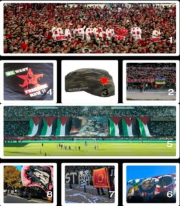 تعبِّر مجموعات الألتراس عن هويتها السياسية من خلال عدد من الرموز البصرية والممارسات الميدانية. يظهر ذلك، أولًا، عبر المنتوجات الرسمية للمجموعة أو أعلامها المعتمدة، التي تتضمن شعارات ذات حمولة سياسية واضحة، من قبيل النجمة الحمراء أو قبضة اليد(24). كما تُرفع صور بعض الشخصيات ذات الرمزية النضالية، مثل صورة تشي غيفارا (Che Guevara)(25) أو موحا أحمو الزياني(26). في السياق نفسه، تعمد مجموعات ألتراس مغربية إلى رفع أعلام دول معينة كموقف مناصر لقضايا التحرر الوطني، وعلى رأسها علم فلسطين، الذي بات مشتركًا بين جل المجموعات المغربية(27).