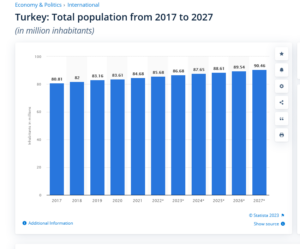 تظهر الإحصائية إجمالي عدد سكان تركيا من عام 2017 إلى عام 2021، مع توقعات حتى عام 2027. في عام 2021، بلغ إجمالي عدد سكان تركيا حوالي 84.68 مليون نسمة (المصدرhttps://bit.ly/3F2V0oI )