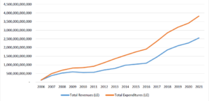 شكل (10): الإيرادات العامة والنفقات العامة خلال الفترة 2006-2021(41)