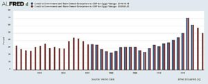 شكل (12): نسبة الائتمان الموجه للحكومة والقطاع العام إلى الناتج المحلي الإجمالي خلال الفترة 1980-2019م(64)