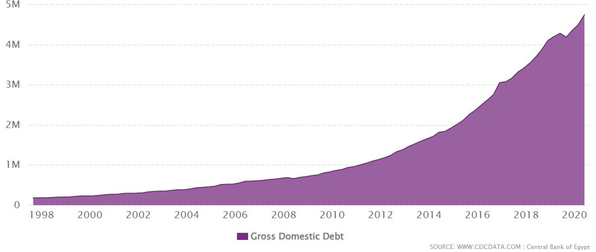 وعلى هذا الصعيد، فقد أفرطت الحكومة المصرية بالاستدانة، داخليًّا وخارجيًّا، طوال عدة عقود الماضية، مع تراوح في درجة الاعتماد بينهما. من جانبه، أدرك نظام مبارك مخاطر الإفراط بالاستدانة الخارجية بتجربته طوال الثمانينات التي كادت مصر تفلس بنهايتها، لولا الإنقاذ بإلغاء نصف الديون وجدولة نصفها الآخر كثمن لمشاركتها في حرب الخليج الثانية 1990، واستدار للاعتماد على الاستدانة الداخلية بالأساس طوال العقدين الباقيين من عهده. ومن ناحيته، نسخ نظام السيسي في عقده المنصرم عقد الثمانينات المباركي بالإفراط في الاستدانة الخارجية، مستهلكًا أغلب القروض في بنية تحتية ومشاريع قومية بعضها مشكوك في جدواه وبعضه بعيد العوائد بأفضل الأحوال، أي لم ينعكس بشكل مباشر في نمو الإنتاج أو الاستثمار المحلي، مما سنتناوله في موضعه.