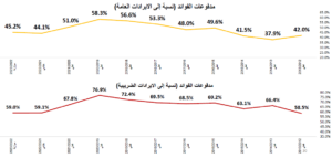 شكل (7): نسبة مدفوعات الفوائد إلى الإيرادات العامة والإيرادات الضريبية في موازنات الفترة 2014-2023(37)