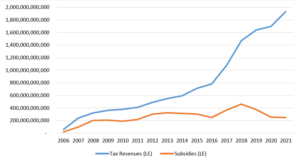 شكل (9): الإيرادات الضريبية ومصروفات الدعم خلال الفترة 2006-2021(40)