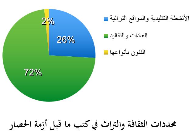 تكررت عناصر محدد الثقافة والتراث في المناهج ما قبل أزمة الحصار (425) مرة، وكانت أغلب التكرارات تركز على عناصر العادات والتقاليد؛ إذ مثَّلت %72 من نسب التضمين، وبلغت نسبة الأنشطة التقليدية والمواقع الأثرية %26، والجدير بالذكر أنها تكررت في مناهج الصف الأول والثاني والثالث فقط. أما بالنسبة لعنصر الفنون فقد كانت نسبته %2 فقط وكانت في كتاب الصف الثاني.