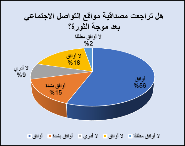وخلال استطلاع الرأي الذي أجراه الباحث، لاستقصاء رأي المبحوثين بشأن تراجع مصداقية مواقع التواصل الاجتماعي بعد موجة ثورات الربيع العربي، أجاب 71% بالموافقة على أن مواقع التواصل تراجعت مصداقيتها، وتوزعت هذه النسبة بين 56% وافقوا على تراجع مصداقيتها، بينما وافق 15% وبشدة على هذا التراجع، واعترض على ذلك 18% من المبحوثين ورأوا أن دورها لم يتراجع، بينما “لم يوافق مطلقًا” 2%، ولم يحدد 9% رأيهم واكتفوا بالقول: “لا أدري”.