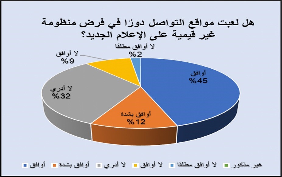 وعندما سأل الباحث عينة المستجوبين: هل لعبت مواقع التواصل دورًا في فرض منظومة غير قيمية على الإعلام الجديد؟ وافق 57% على ذلك، وتوزعت النسبة بين 12% وافقت بشدة، واكتفت 45% بالإجابة بنعم، وهو ما يعكس حالة التشكيك على المدى البعيد بوسائل الإعلام الجديد المفتقرة إلى قيم إعلامية، وهو أمر يجعله أقرب ما يكون إلى التجارة في بورصات المال والأعمال، بحيث يكون هذا الموقع اليوم بيد شخص وغدًا بيد آخر، ويباع معه المستخدمون وبياناتهم كاملة، في حين أجاب 32% بـ”لا أدري”، ولم يتفق 11.2% مع السؤال.