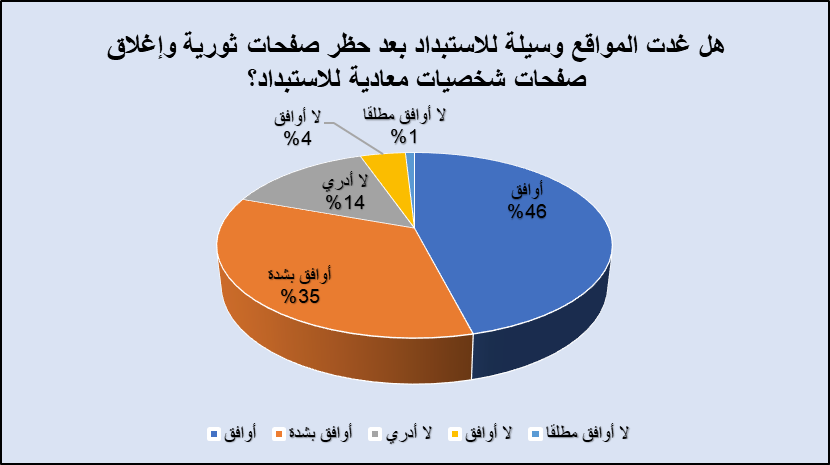 وهنا، وجه الباحث سؤالًا للمستجوبين: هل أصبحت المواقع وسيلة للاستبداد بعد حظر صفحات ثورية؟ فكانت نسبة الإجابة بنعم كبيرة؛ حيث وافق 81% من المبحوثين أن المواقع باتت وسيلة للاستبداد بعد حظر صفحات ثورية وإغلاق صفحات شخصيات معادية للاستبداد، ولم يُجِب بـ”لا أوافق” سوى نسبة صغيرة من المبحوثين بلغت 5%، وتوزعوا بين من اكتفى بالقول: “لا أوافق” 4%، ونسبة 1% قالت: “لا نوافق مطلقًا”، في حين لم يحدد 14% من المستجوبين رأيهم واكتفوا بعبارة: “لا أدري”.
