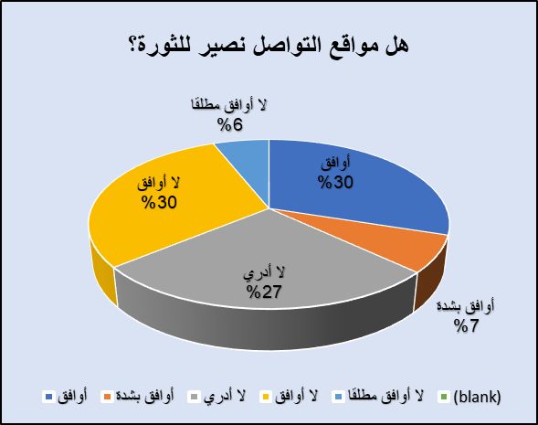 وحين سُئِل المبحوثون حول ما إذا كانت مواقع التواصل الاجتماعي لا يزال يُنظَر إليها باعتبارها مواقع نصيرة للثورات كما كانت قناعتهم في البداية، فقد جاءت النتيجة شبه متقاربة بين مؤيد ومعارض؛ إذ عبَّر 37% من المبحوثين عن موافقتهم على اعتبار مواقع التواصل نصيرة للثورات، بينما لم يوافق 36%، ورأت شريحة مهمة تمثِّل 27% من المستطلعة آراؤهم أنها “لا تدري” ما إذا كانت المواقع نصيرة للثورة، وهي حالة تعكس نقلة كبيرة في واقع مواقع التواصل الاجتماعي عمَّا كانت عليه قبل عشر سنوات في أعين مؤيدي الاحتجاجات.