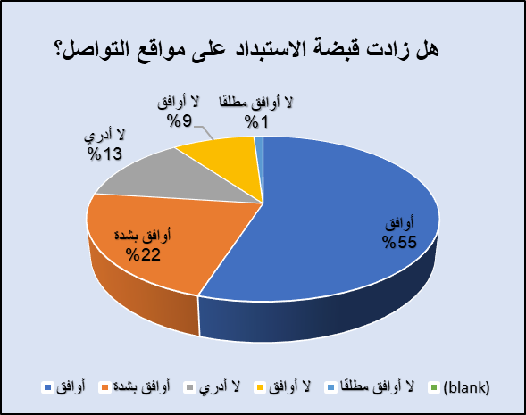 ولعل هذا يفسره السؤال الآخر الذي وجهه الباحث للمستجوبين: هل تعتقد أن قبضة الاستبداد قد زادت على مواقع التواصل الاجتماعي؟ حيث رأى غالبية المبحوثين أن القبضة زادت، وهو ما يفسر الجواب الأول بأن هذه المواقع لم تعد نصيرًا للثورات كما كان عليه الأمر من قبل، وقد أجاب 77 منهم بأن قبضة الاستبداد زادت بالفعل على مواقع التواصل الاجتماعي، وكانت نسبة 22% تتفق بشدة، بينما لم توافق نسبة 10% على ذلك، وذهبت نسبة 13% من المستجوبين إلى القول: لا أدري.