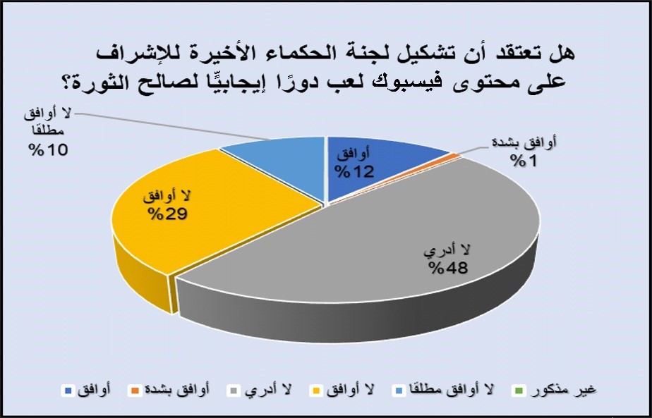 وحين سأل الباحث المستجوبين عن تشكيل لجنة الحكماء للإشراف على محتوى فيسبوك وفيما إذا كانت تلعب دورًا إيجابيًّا لصالح الثورات، لم يوافق 39% من المبحوثين على ذلك؛ إذ أبدى 29% رفضهم و10% رفضوا ذلك بشدة، في حين وافق على هذا الدور الإيجابي 12% فقط من المستجوبين ووافق بشدة 1.1% أيضًا، أما 48% فاكتفوا بعبارة: “لا أدري”. وهي حالة تعكس ضبابية دور هذه اللجنة أمام مستخدمي فيسبوك وعدم فاعليتها، حيث لم تظهر في أي مؤتمر صحافي، ولم تقدم أي تقرير سلبًا أو إيجابًا عن موقع فيسبوك.