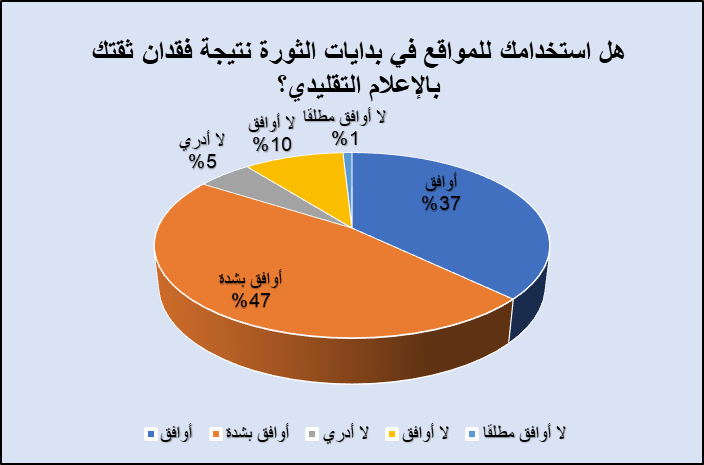 ويرى مارك لينش (mark lench ) أن الجزيرة ومواقع التواصل الاجتماعي، مثل فيسبوك وتويتر، قد سرَّعت من حملة الاحتجاجات في “العالم العربي، من خلال نقل الصور والمشاعر والأفكار عبر الحدود”(16)، ويبيِّن الاستطلاع الذي أجراه الباحث أن أغلبية ساحقة بلغت 84% تتفق مع من يقول إن استخدامها لمواقع التواصل الاجتماعي في بدايات الثورة جاء نتيجة فقدان ثقتها بالإعلام التقليدي، وتوزعت هذه النسبة بين 47% أجابت بأوافق بشدة، بينما أجابت بأوافق فقط 37%، وعبَّرت نسبة 10% عن عدم موافقتها، بنيما اكتفت نسبة 5% بعبارة: “لا أدري”، وكانت نتيجة لا أوافق مطلقًا أقل من واحد بالمئة.