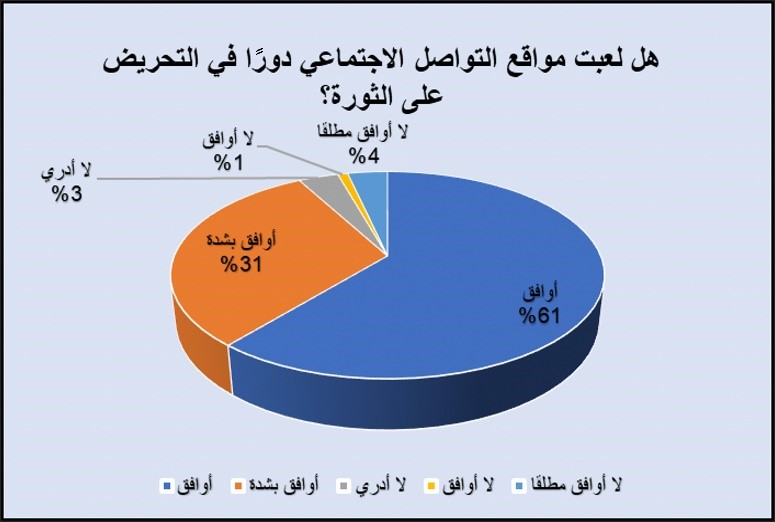 وافقت نسبة عالية جدًّا على دور مواقع التواصل الاجتماعي في التحريض على الثورة السورية؛ حيث أكد 92% من المبحوثين على دور مواقع التواصل الاجتماعي في الثورة، وتوزعت هذه النسبة على 61% ممن وافقوا على هذا الدور، بينما وافق بشدة 31% من المبحوثين على دور هذه المواقع في التحريض على الثورة السورية. ولم توافق نسبة 5% على دور مواقع التواصل في التحريض على الثورة السورية، أما المبحوثون الذين لم يحددوا رأيهم واكتفوا بعبارة: “لا أدري” فبلغت 3%.