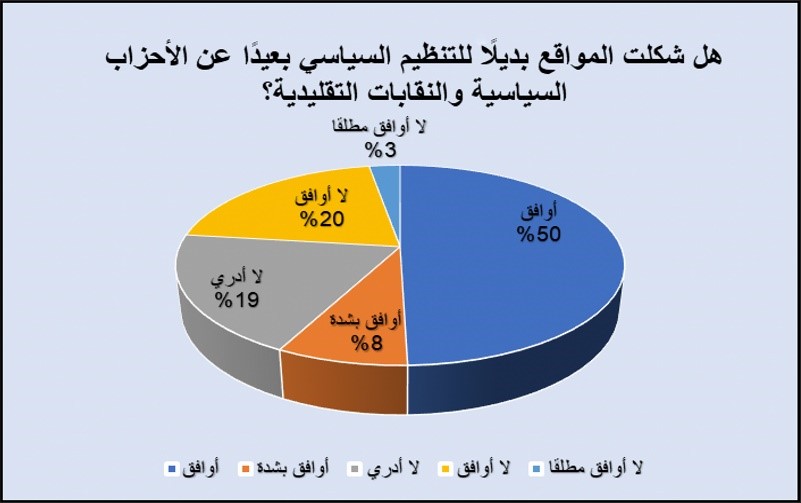 لقد ظلت تلك الأجسام السياسية التقليدية تتعامل مع الثورة على أن الخلاف بين معارضة وحكومة، وهو ما أبعدها في كثير من الأحيان عن توصيف واقع حقيقي برز بعد جيل الثورات، انعكس ذلك في تغريد الشارع بما يتناقض مع هياكل وأجسام سياسية للمعارضة التي بدا أنها تفتقر إلى الحاضنة والدعم المجتمعي، بعد أن ظلت المعارضة تطبق أساليب قديمة في التواصل مع الخارج دون الالتفات إلى جيل الشباب صاحب النشاط الأهم على مواقع التواصل الاجتماعي. وقد تبين من خلال الاستطلاع الذي أجراه الباحث أن نسبة كبيرة من المستجوبين يعتقدون أن وسائل التواصل الاجتماعي قد حلَّت محلَّ الأحزاب السياسية والنقابات المهنية، وأجاب 58% منهم بالإيجاب على سؤال: هل شكَّلت المواقع بديلًا للتنظيم السياسي بعيدًا عن الأحزاب السياسية والنقابات التقليدية؟، وتوزعت هذه النسبة بين 50% من المبحوثين الذين أبدوا موافقتهم، و8% وافقوا بشدة، ونزع 20% من المستجوبين إلى الرفض، بينما مالت نسبة 3% إلى الرفض المطلق، واكتفت نسبة 19% ممن شملهم الاستطلاع بالقول: “لا أدري”.