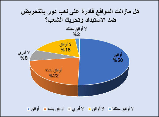 لكن ظل المبحوثون يعتقدون أن المواقع لا تزال قادرة على لعب دور في تحريض الشارع العربي؛ فقد أجاب 72% ممن شملهم الاستطلاع بنعم حين سُئلوا عن قدرة المواقع على تحريك الشارع العربي مجددًا، وتوزعت الإجابة بين 50% اكتفت بنعم، و22% وافقت وبشدة على القدرة على تحريك الشارع العربي. بينما رأى 21% منهم أن المواقع لم تعد لها قدرة على تحريك الشارع، ولم تحدد نسبة 8% من المستجوبين رأيها واكتفت بعبارة: “لا أدري”.